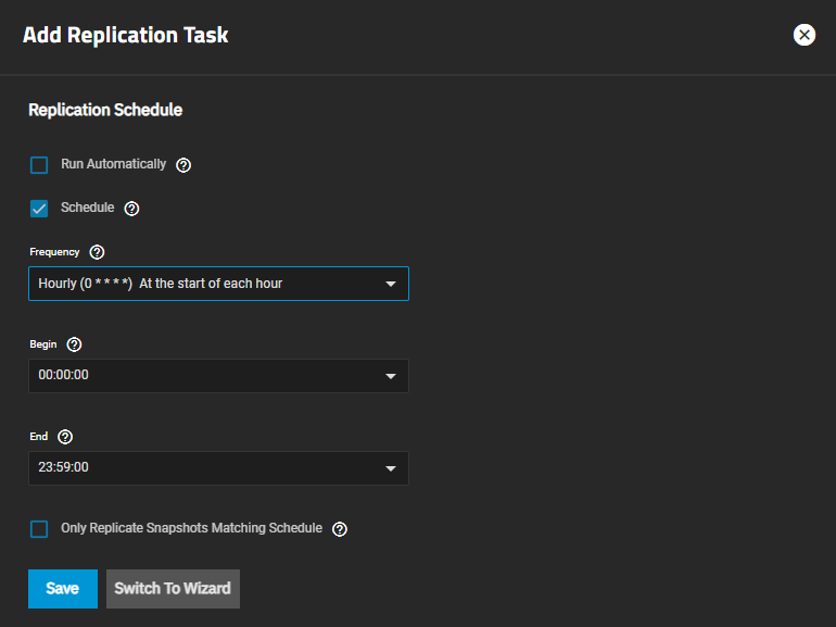 These schedule setting options are common to both the Replication Task Wizard and Add Replication Task screens.