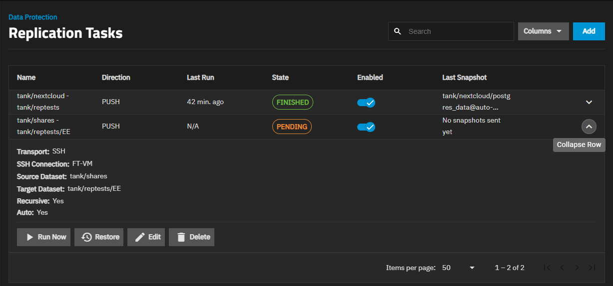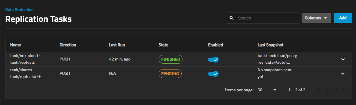 Columns shows a list of options to customize the list view to add or remove information to the table. Options are: Select All, Name, Direction, Transport, SSH Connection, Source Dataset, Target Dataset, Recursive, Auto, Last Run, State, Enabled, Last Snapshot, and Reset to Defaults.