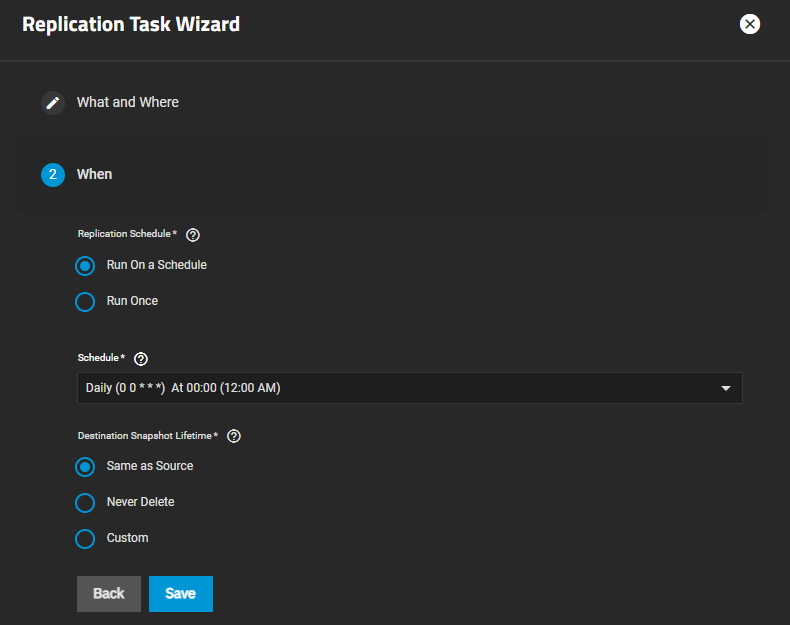 The When wizard screen sets the schedule for running the task and the retention period for keeping the replicated snapshots. Replication Schedule and Destination Snapshot Lifetime options change the setting displayed on the screen.