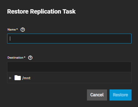 Destination sets the mount path where TrueNAS creates the new file resulting from the restore operation.