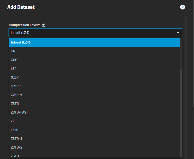Datasets can also be encrypted. In TrueNAS 22.12.3 or later, the TrueNAS UI requires encryption for child datasets created in encrypted parent datasets, but you can change the encryption type from key to passphrase. You can create an encrypted dataset if the parent is not encrypted and set the type as either key or passphrase.
