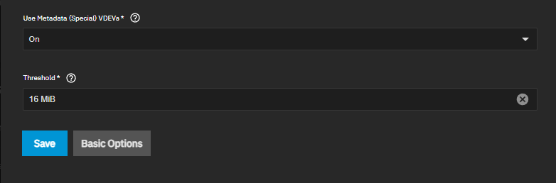 Select On to enable storing data blocks in the special allocation class. The Threshold field appears. Enter a maximum block size (1 byte to 16 MiB) for blocks to store in the special class. The default threshold is 16 MiB. Blocks smaller than or equal to the threshold are assigned to the special allocation class; larger blocks are assigned to the regular class.