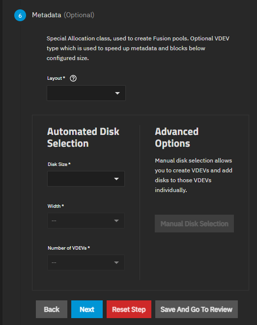 Select the root dataset of the pool (with the metadata VDEV), then click Add Dataset to add the dataset. Click Advanced Options. Enter the dataset name and select the Dataset Preset, then scroll down to the Use Metadata (Special) VDEVs setting.