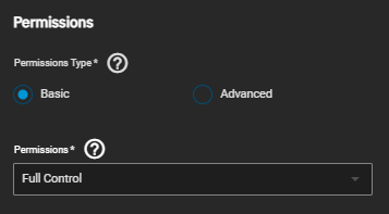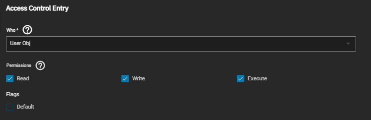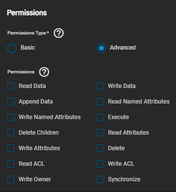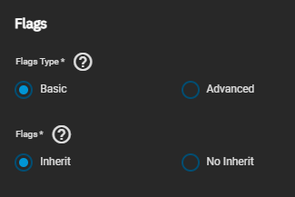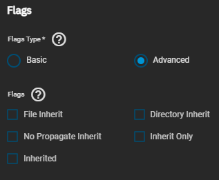 TrueNAS divides permissions and inheritance flags into basic and advanced options. The basic permissions options are commonly-used groups of advanced options. Basic inheritance flags only enable or disable ACE inheritance. Advanced flags offer finer control for applying an ACE to new files or directories.