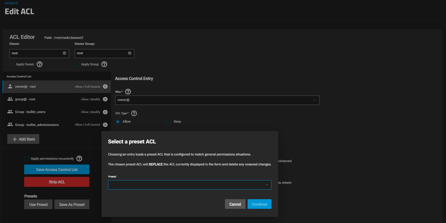 There are two different Select a preset ACL windows, one for the POSIX ACL and the other for the NFSv4 ACL. Selecting a preset replaces the ACL currently displayed on the Edit ACL screen and deletes any unsaved changes.