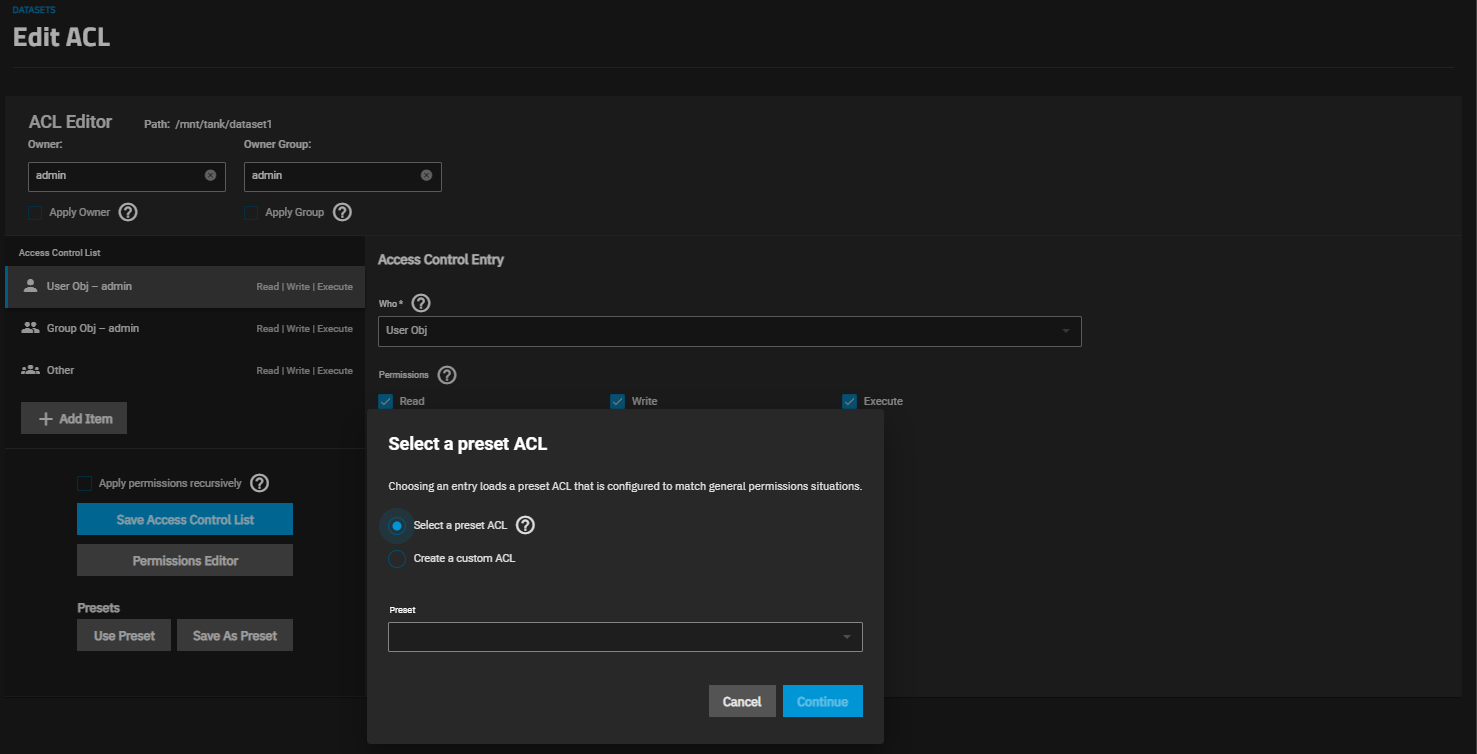The ACL Type setting in the Advanced Options on both the Add Dataset and Edit Dataset screens, determines the ACL presets available on the ACL Select a preset ACL window. It also determines which permissions editor screens you see after you click the edit icon on the Dataset Permissions widget.