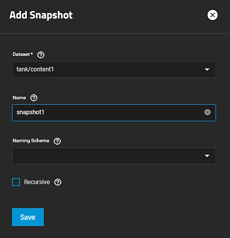 If you click Create Snapshot the Snapshots screen opens filtered for the selected dataset. Clear the dataset from the search field to see all snapshots.