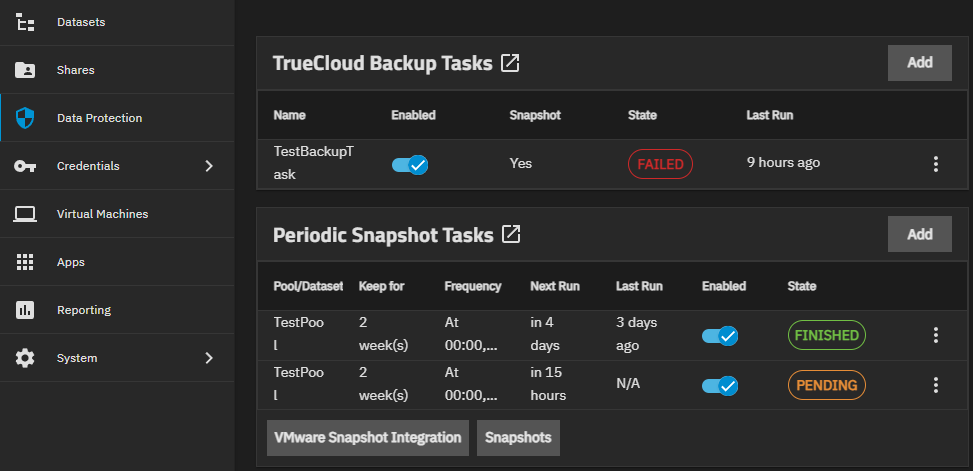 - Go to Data Protection, locate the Periodic Snapshot Tasks widget, then click the Snapshots button in the lower right-hand corner of the widget.