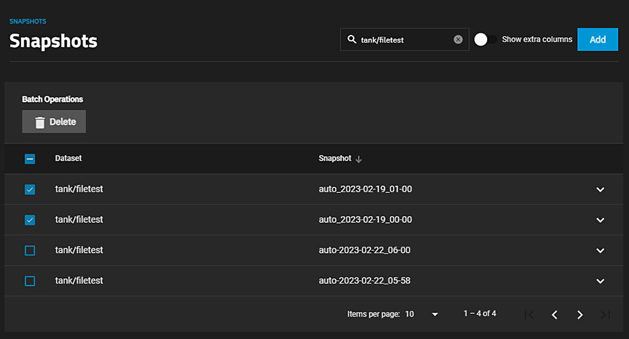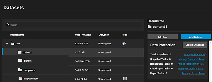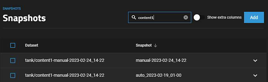 - Go to Datasets > Data Protection widget > Manage Snapshots link to open the Snapshots screen.