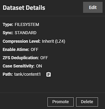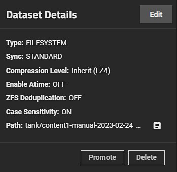 After clicking the Promote button, the dataset clone is promoted and this button no longer appears.