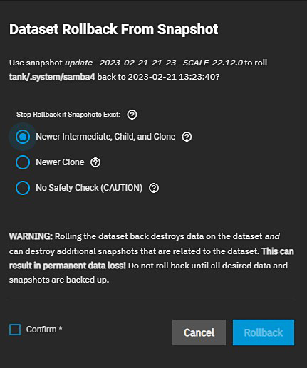 TrueNAS asks for confirmation before rolling back to the chosen snapshot state. Select the radio button for how you want the rollback to operate.