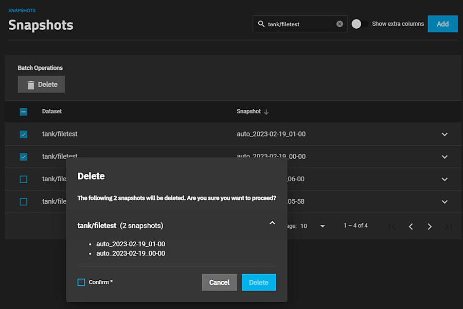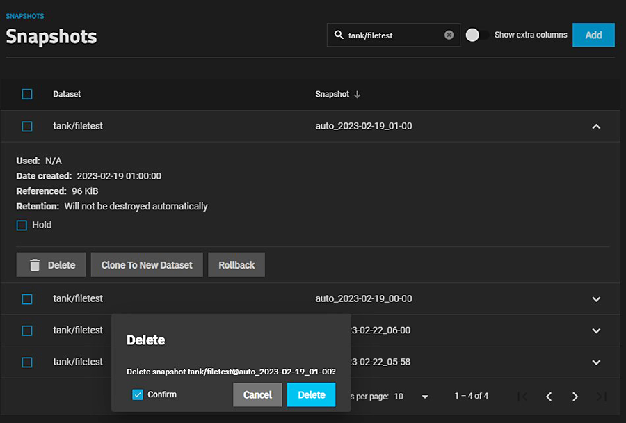 Confirm activates the Delete button. If the snapshot has the Hold options selected, an error displays to prevent you from deleting that snapshot.