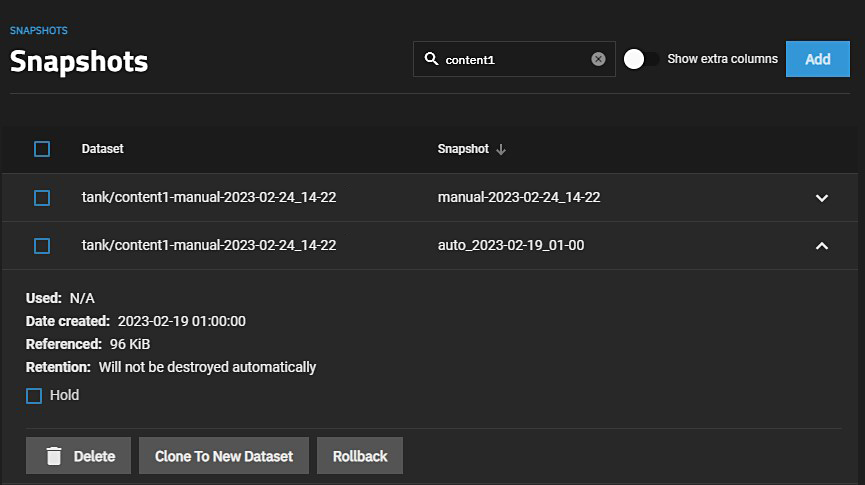 The Rollback option reverts the dataset to the point in time saved by the snapshot.