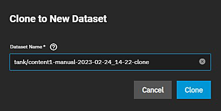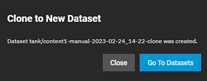 Use the Clone to New Dataset button to create a clone of the snapshot. The clone appears directly beneath the parent dataset in the dataset tree table on the Datasets screen. Click Clone to New Dataset to open a clone confirmation dialog.