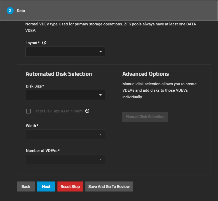 dRAID layouts do not show the Manual Disk Selection button but do show additional Automated Disk Selection fields. When configuring a dRAID data VDEV, first, choose a Disk Size then select a Data Devices number. The remaining fields update based on the Data Devices and dRAID layout selections.