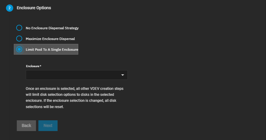 Limit Pool To A Single Enclosure applies a minimum dispersal strategy. Select the expansion shelf option on the Enclosure dropdown. Disks added to the pool VDEVs are spread across the enclosure disks that align with the selection in Enclosure.