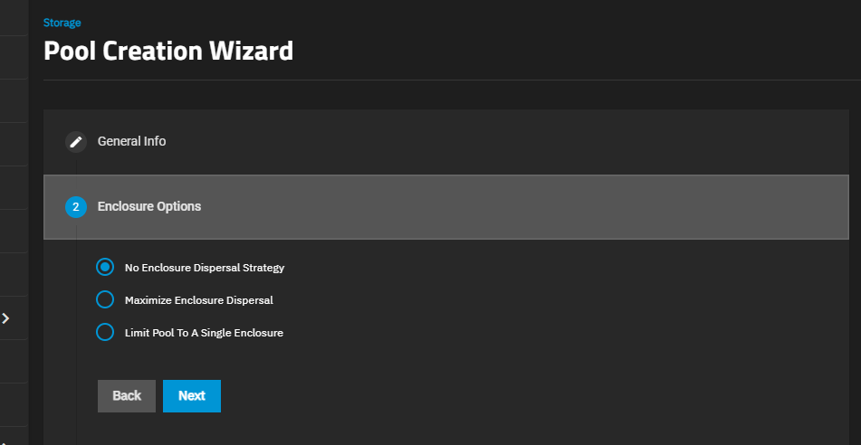 You can rename your enclosure on the Enclosure screen to include the rack and U number in the name, which helps identify the physical location while in the pool creation screen.The dispersal strategy sets how the system adds disks by size and type to the pool VDEVs created using the Automated Disk Selection option. Enclosures mentioned in the options below refer to the disk enclosures in the expansion shelves and main system chassis.