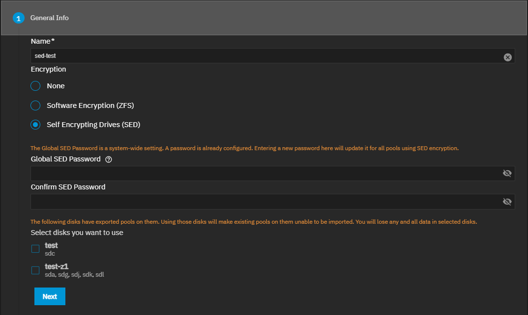 TrueNAS EnterpriseIf your Enterprise system is licensed for and has SED drives, you can select Self-Encrypting Drives (SED) to create a pool with SED drives and encryption. You may only select SEDs when using Self-Encrypting Drives (SED) encryption.