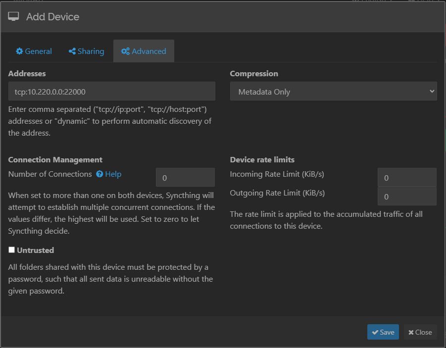 Click Advanced. Enter the device address and port for the first Syncthing instance, in the format