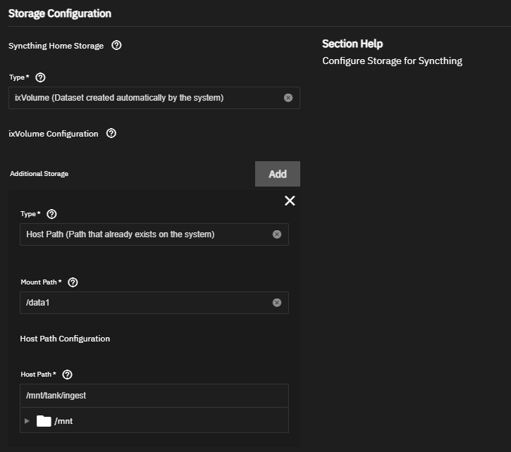 e. Select ixVolume (Dataset created automatically by the system) or configure an existing host path for Syncthing Home Storage under Storage Configuration.