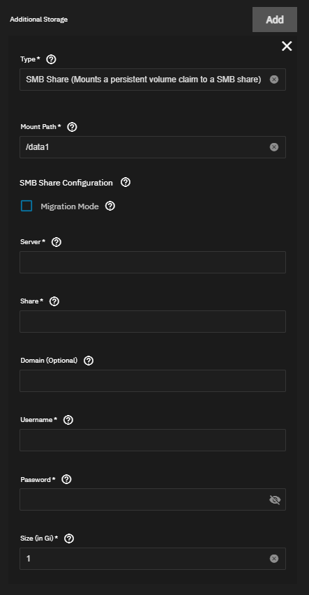 f. Select SMB Share (Mounts a persistent volume claim to an SMB share) from the Type dropdown for Additional Storage.