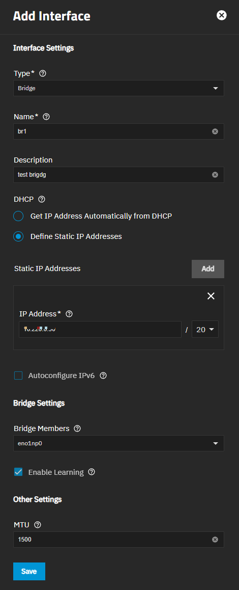 Allow TrueNAS to create an automatic bridge (default).