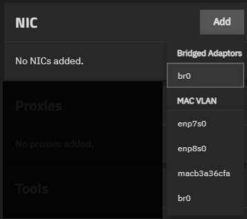 After adding the bridge and to assign the bridge to a VM or container, go to Instances, select the instance you want to use to access TrueNAS storage, and locate the NIC widget. Click Add and select the new bridge interface from the dropdown list.