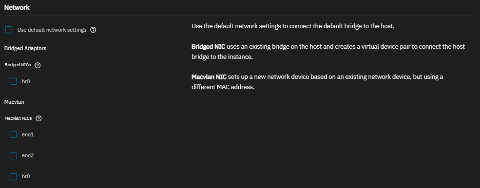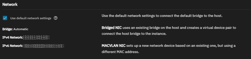 Leave Use default network settings selected while creating a new instance to allow TrueNAS to automatically assign the default network bridge. This is the simplest way to allow communication between containers and the TrueNAS host.