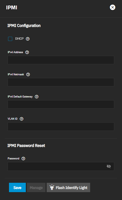 | Remote Controller (HA only) | Select which controller to configure IPMI settings for. Options are Active or Standby controller. All IPMI configuration changes and the identify light feature apply only to the selected controller. |
