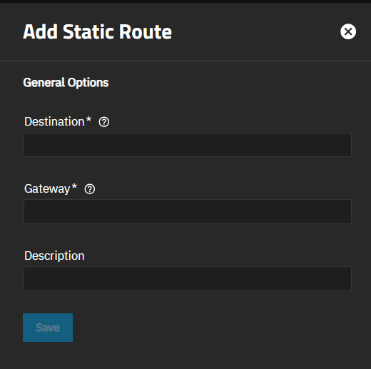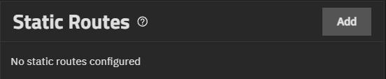 The Static Routes widget on the Network screen shows static IP addresses configured as static routes. Allows manual entry of IP address routes to network destinations outside the TrueNAS network so the router can send packets to a destination network.