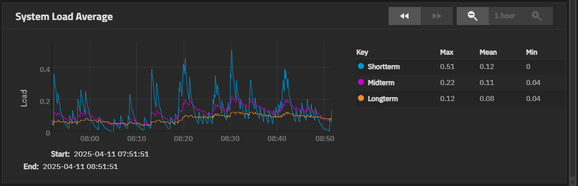 Shows the CPU temperature, CPU usage, and system load graphs. CPU graphs show the amount of time the CPU spends in various states such as executing user code, executing system code, and idle time. Graphs show short-, mid-, and long-term loads, along with CPU temperature graphs.
