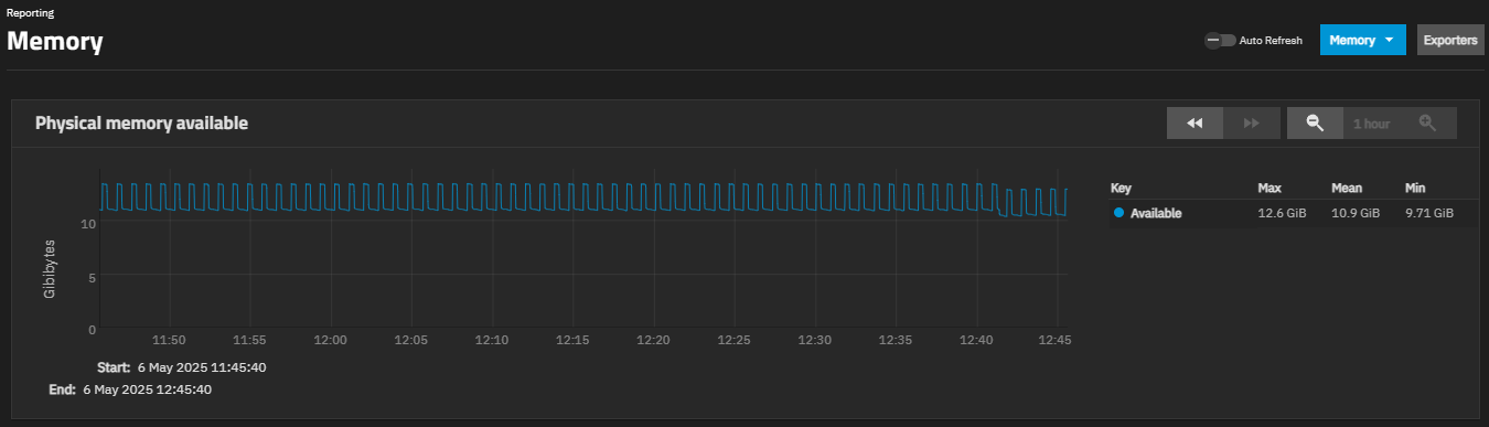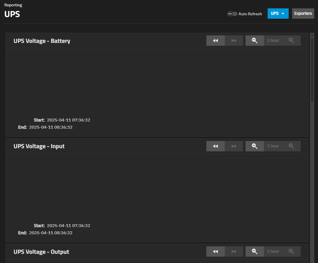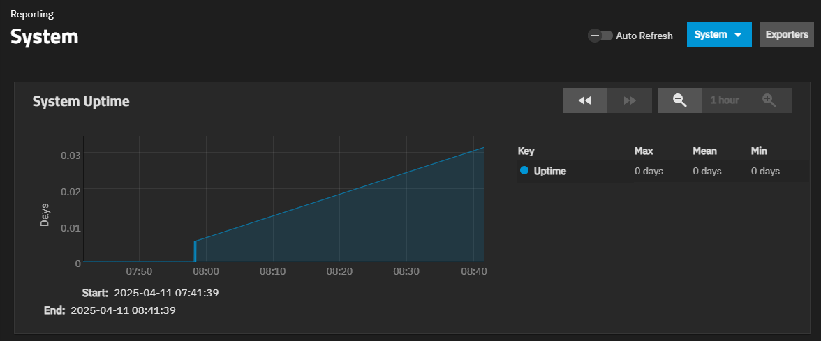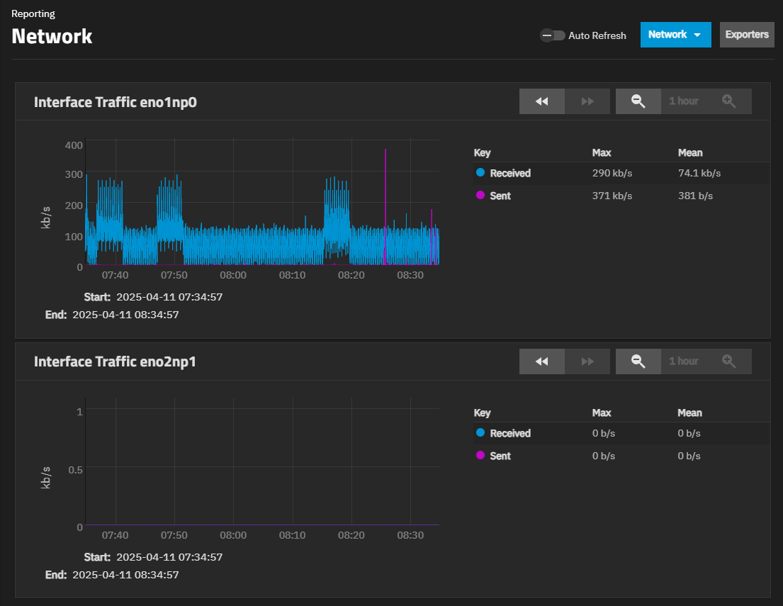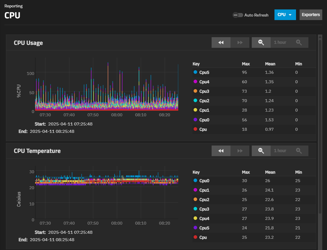 The Auto Refresh toggle updates the graphs with the latest reporting data every few seconds. When active, the graph resets to the chosen Reset Zoom view every time the reporting data updates. Disable Auto Refresh before manually zooming in on any section of the graph.