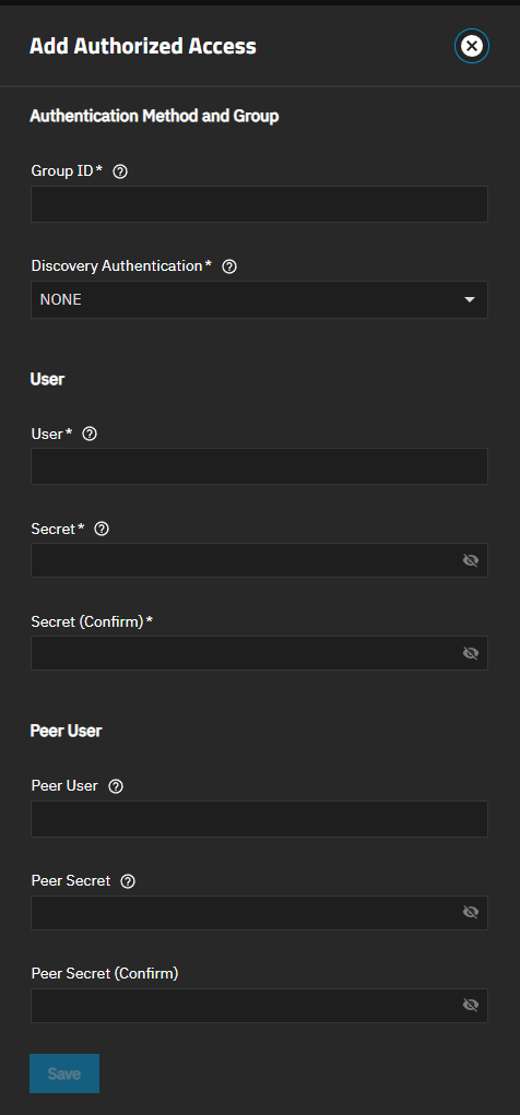 b. Select the discovery method from the dropdown list. None allows anonymous discovery. CHAP uses one-way discovery. Mutual CHAP uses two-way discovery, but not show as an option until you add the Peer User and Peer Secret credentials.