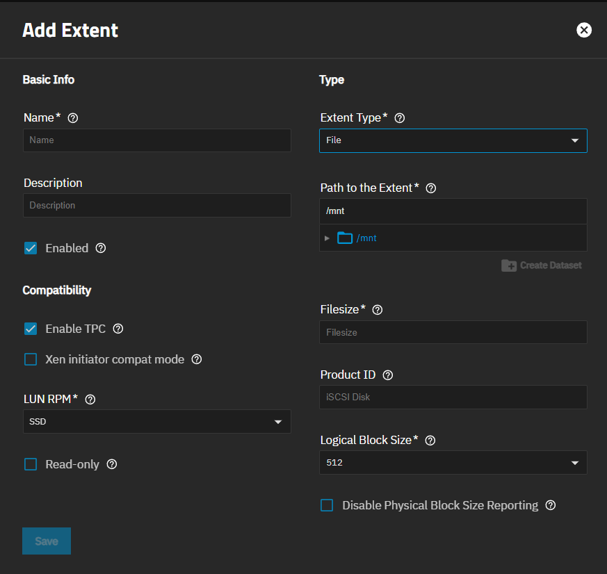 b. Add a description about the extent if you want, but this is not required. The description shows in the Target table on the Targets screen and the iSCSI Block Share Targets widget and helps identify the share use or purpose.