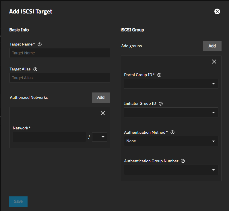 TrueNAS allows users to add iSCSI targets without adding the extent, portal, initiators, etc. You can create the target and add the rest later.