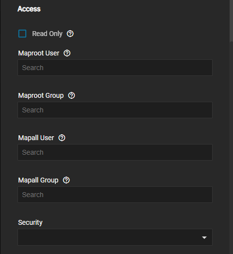 To map group permissions to the root user, enter a string or select the group from the Maproot Group dropdown list. To map the group permissions to all clients, enter a string or select the group from the Mapall Group dropdown list.