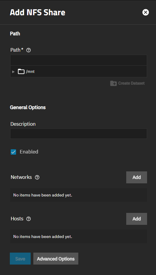 If creating a dataset and share from the Add Dataset screen, we recommend creating a new dataset with the Dataset Preset set to Generic for the new NFS share. Or you can set it to Multiprotocol and only select the NFS share type.