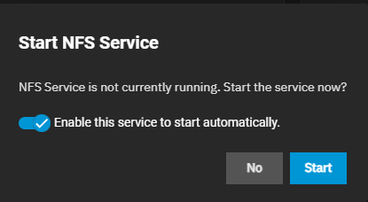 Or you can go to System > Services, locate NFS, and click the Start Service button to start the service. Toggle Start Automatically on if you want NFS to activate when TrueNAS boots.