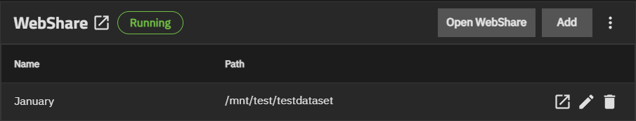 To modify an existing WebShare, click the icon on the share row. The Edit WebShare screen allows you to change the path, name, and home share setting.