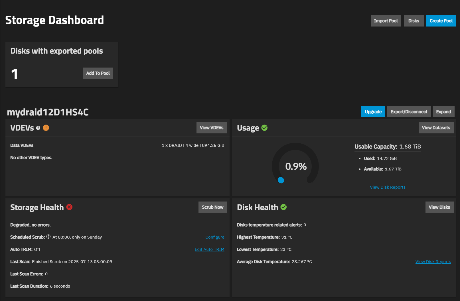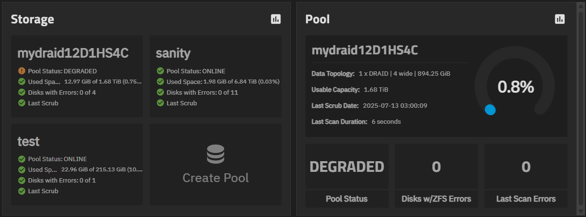 If you configure your main TrueNAS Dashboard to include an individual Pool or the Storage widgets, they show the status of your system pools as on or offline, degraded, or in an error condition.