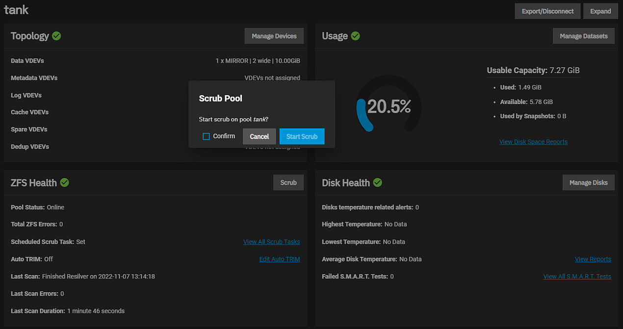 The Storage Dashboard pool widgets also show the status of each of your pools.