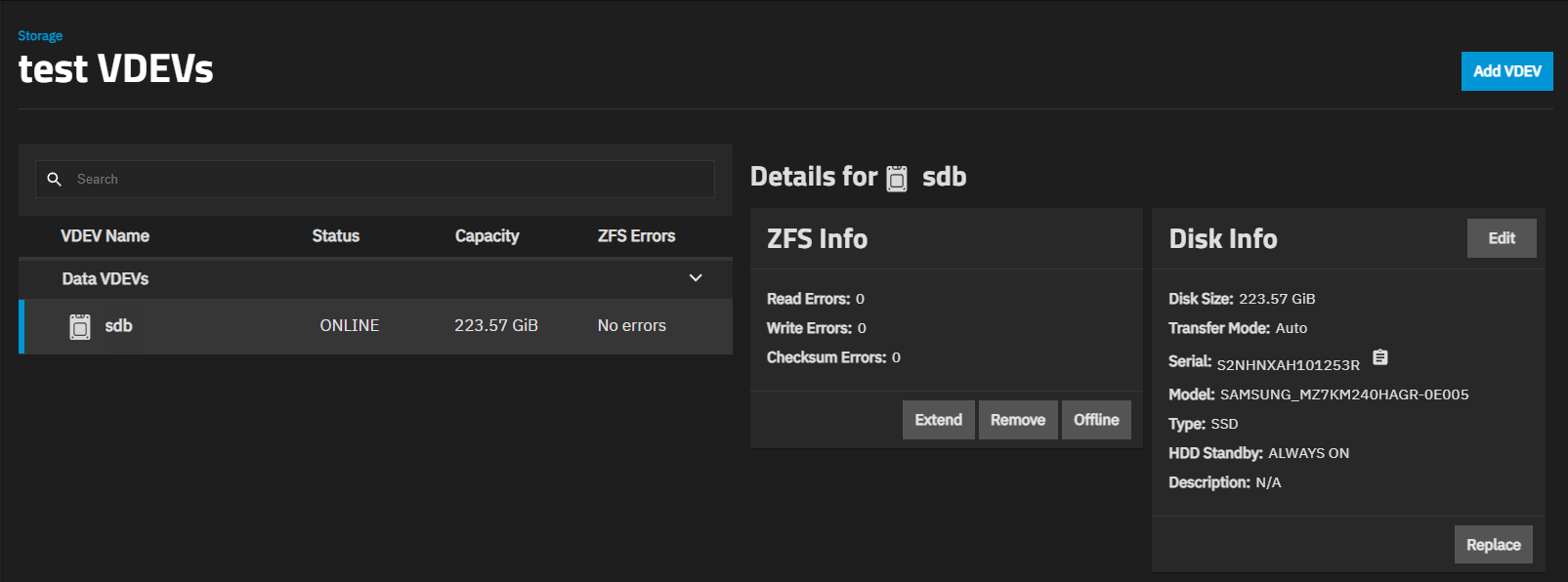 Each disk in a VDEV has two cards that show information for that disk: ZFS Info and Disk Info. After selecting a disk, the cards show on the right side of the screen in the Details for diskname area of the screen.