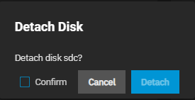 Detach opens a confirmation dialog and removes the selected drive from the parent VDEV.
