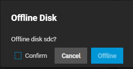 Offline opens a confirmation dialog and takes the selected drive to an offline state before taking a disk offline to replace it. Toggles to Online so you can bring a replacement disk online. After taking a drive offline, you can remove or replace the physical drive.