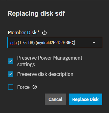 The *Replacing disk diskname dialog allows replacing the selected disk with a new disk selected from the Member Disk dropdown list.