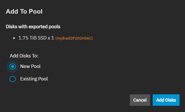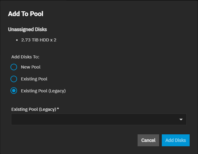 Add Disks opens the Pool Creation Wizard when New Pool is selected. It opens the Add VDEVs to Pool wizard when Existing Pool is selected. The Storage link in the breadcrumb at the top of the screen returns you to the Storage Dashboard to cancel out of adding to a new or existing pool.