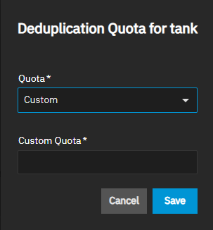 The Deduplication Quota for poolname shows the Quota dropdown list with three options for setting the maximum size limit the deduplication table can reach.