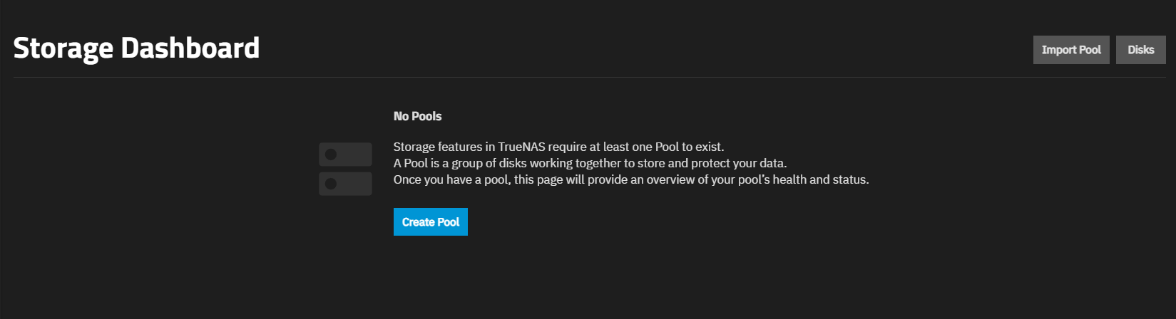 The Storage Dashboard screen allows users to configure and manage storage resources such as pools (VDEVs) and disks. The dashboard widgets organize functions related to storage resources.