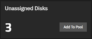The Unassigned Disks widget at the top of the Storage Dashboard shows when disks are available to add to a new or existing pool. If the system has disks available and that are associated with exported pools, the Disks with exported pools shows instead. The number of available disks shows, and the Add to Pool button. The pool with the system dataset, and the state of the pool, shows in the dialog.