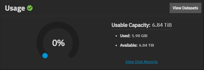 The Usage widget shows information on the pool space datasets consumed and the status of pool usage.
